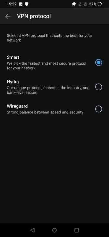 The app offers the Hydra protocol by default for establishing an encrypted connection between your device and remote VPN endpoints. The TLS-based protocol offers support for WireGuard and IKEv2/IPSec in the latest Android devices. When your connection is established, your real IP address will be replaced with a virtual address.